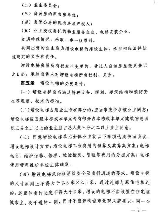 此外,增設電梯還須保證消防安全及出行通道的要求。增設電梯的尺寸原則上不得大于2.5米×2.5米,通過連廊與原住宅相連的,連廊伸出的長度不得大于2米。增設的電梯不應設置在住宅臨城市主、次干道的一側,同時不應影響城市景觀風貌要求,同一個小區(qū)增設電梯應保持整體統(tǒng)一、規(guī)范、有序、美觀。