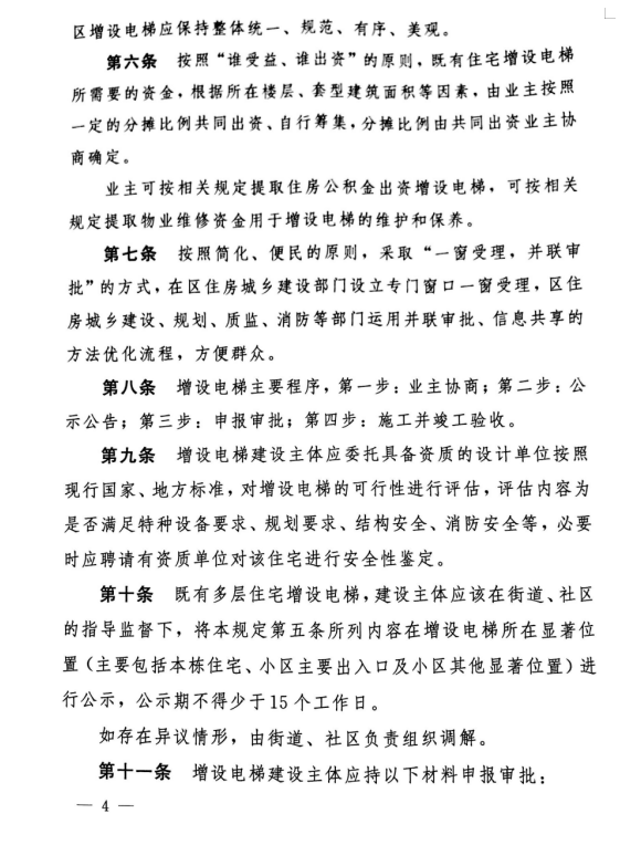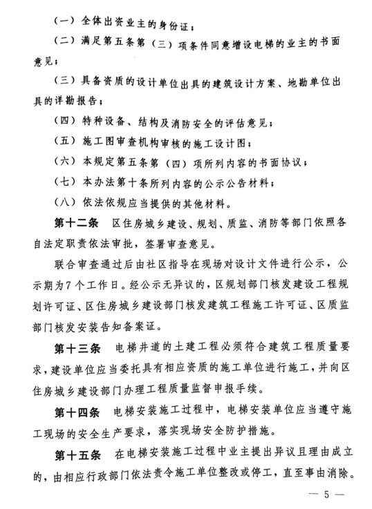 同時,同意增設電梯單元全體業(yè)主要就增設電梯設計方案,增設電梯工程費用的預算及其籌集方案,電梯運行、維護保養(yǎng)、修理、檢驗檢測、管理等費用的分擔方案等事項達成書面協(xié)議,且須在小區(qū)顯著位置進行公示,公示期不得少于15個工作日。